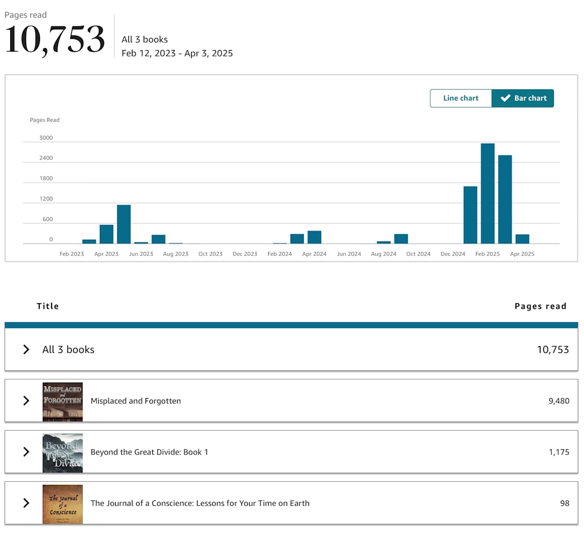 Now, this may seem insignificant, but since I began writing, my only hope was that people would read my books and enjoy the stories. In the first 22 months after publishing 'Misplaced and Forgotten', I had some sales and a handful of mostly positive reviews, but both seemed to stall out after the first few months. I made the book available for free on Kindle Unlimited at the same time as it went to print and got excited when I saw over 1000 pages read back in May 2023. I thought it was just the start of making a name for myself as a new writer. [Side note: "Page Read" counts on Kindle Unlimited pay the author a fraction of a penny per page read.]